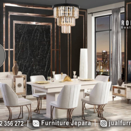 *Harga Hubungi CSModel Terbaru Meja Makan Mewah Berkualitas Model Terbaru Meja Makan Mewah Berkualitas menghadirkan kombinasi elegan antara keindahan alami kayu mahoni dan sentuhan modern yang memukau. Terbuat dari kayu mahoni pilihan, set ini menawarkan kualitas yang tidak hanya terlihat, tetapi juga terasa. Dengan finishing Gold yang melengkapi warna Cream, set meja makan ini menjadi perwakilan keanggunan… selengkapnya