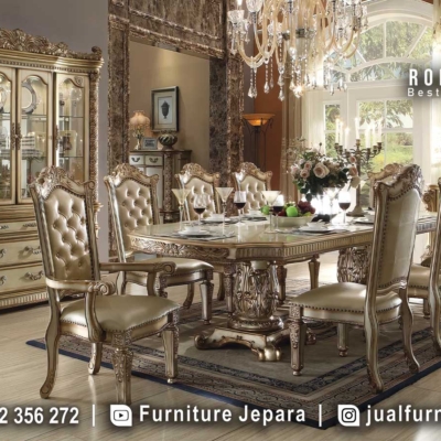 *Harga Hubungi CSMeja Makan Luxury Putih Gold dengan pahat ukiran emas, ideal untuk ruang makan utama Anda. Dapatkan sekarang!