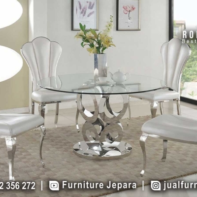 Bayangkan, setiap kali Anda menikmati hidangan bersama keluarga, suasana menjadi lebih hangat dan berkesan dengan kehadiran meja makan yang stylish ini. Misalnya, kaki meja dengan desain lingkaran bertumpuk dan finishing doff chrome memberikan sentuhan unik dan modern. Lebih lagi, kursi empuk berlapis kain bludru putih dengan busa tebal menawarkan kenyamanan maksimal, memungkinkan anggota keluarga maupun tamu merasa betah berlama-lama duduk.